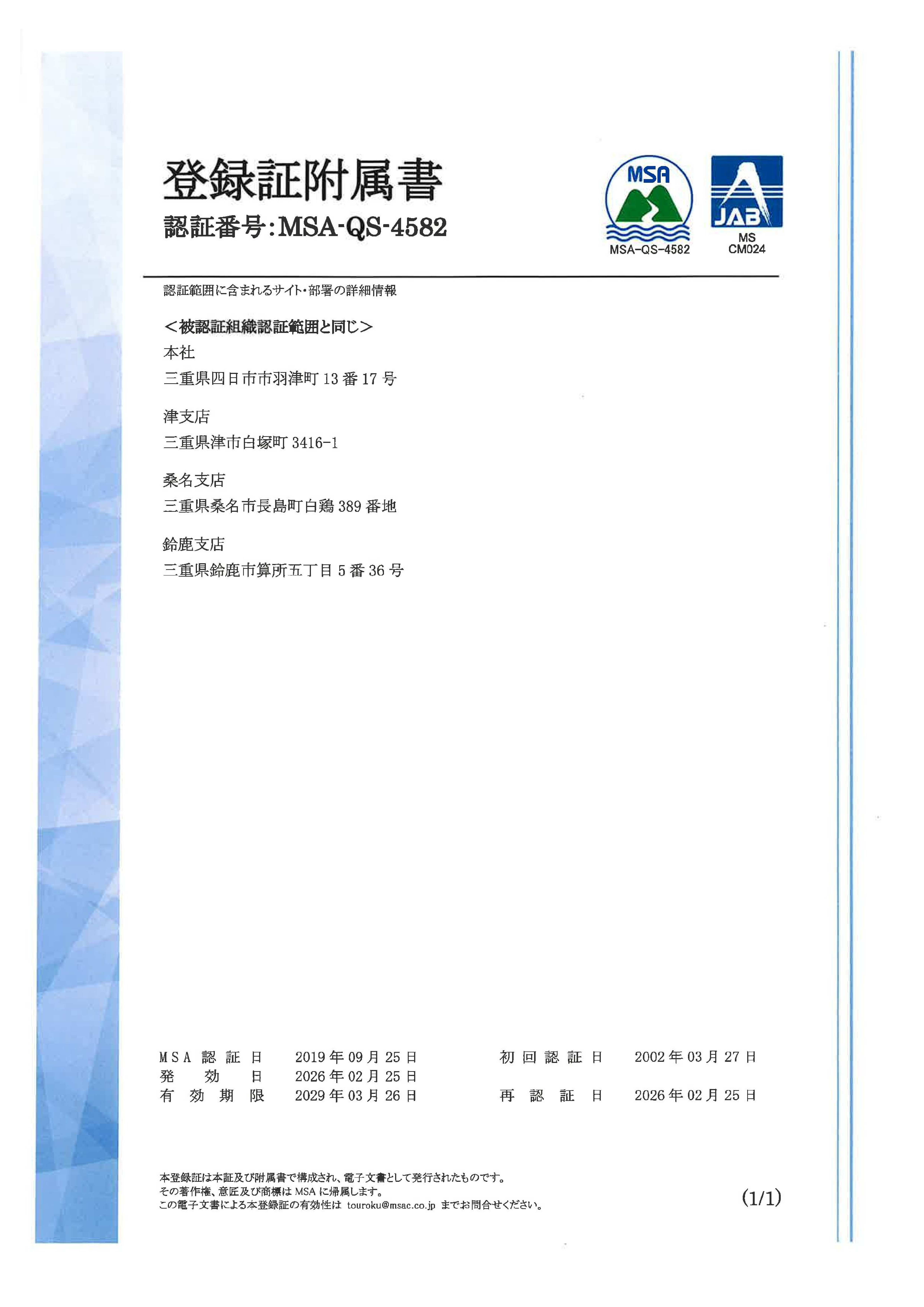 | 令和7年 8月 | 5 | みえ・環境マネジメントシステム・スタンダード更新登録(適用規格:M-EMS ステップ2) 測量業務、建設コンサルタント業務、補償コンサルタント業務 初回登録日:2011年8月1日、更新登録2025年8月1日 |
