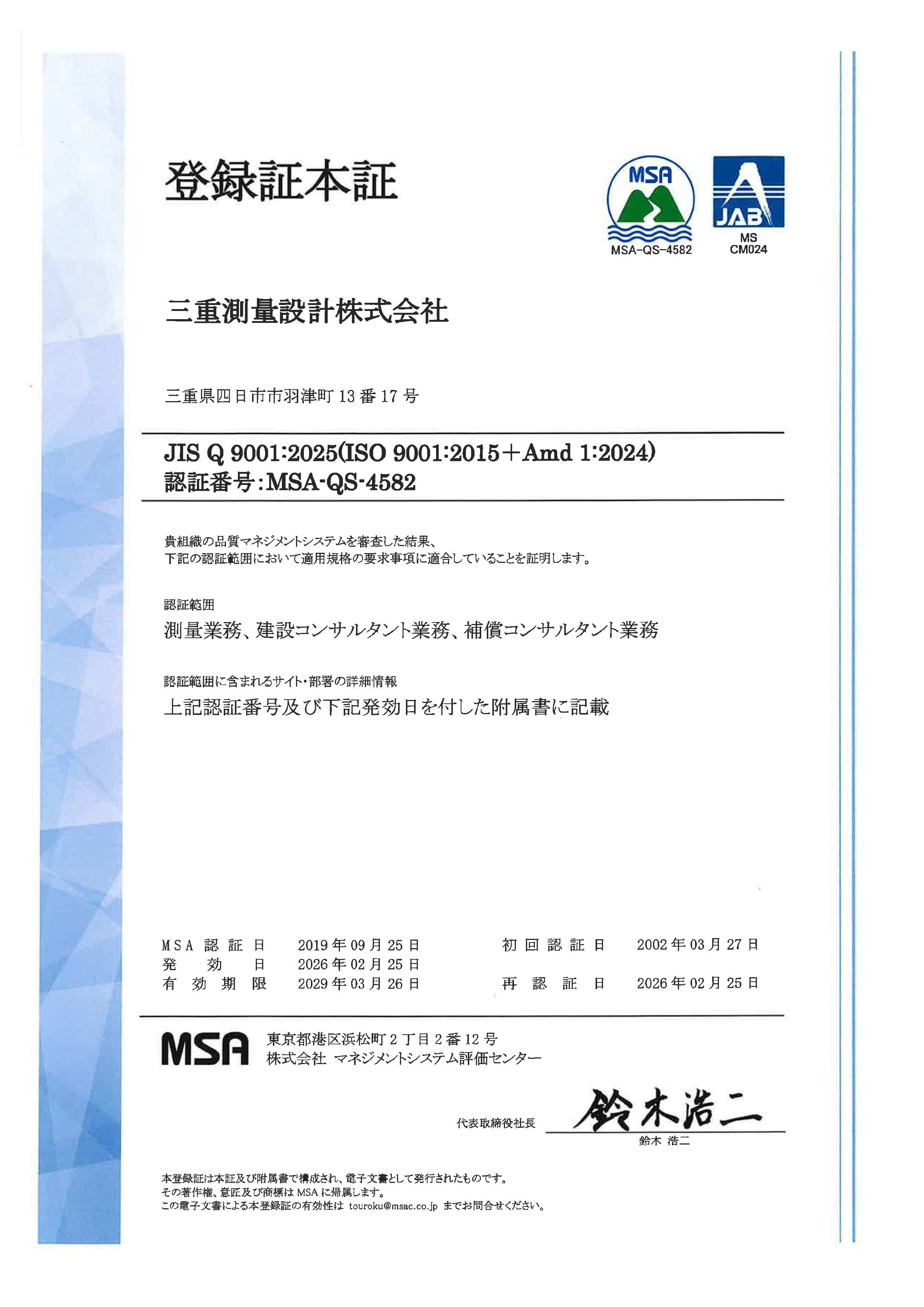 品質マネジメントシステム 再認証登録。 (適用規格:JIS Q 9001:2015/ISO9001:2015) 測量業務、建設コンサルタント業務、補償コンサルタント業務 初回登録日:2002年3月2日、再認証登録:2026年2月25日 |